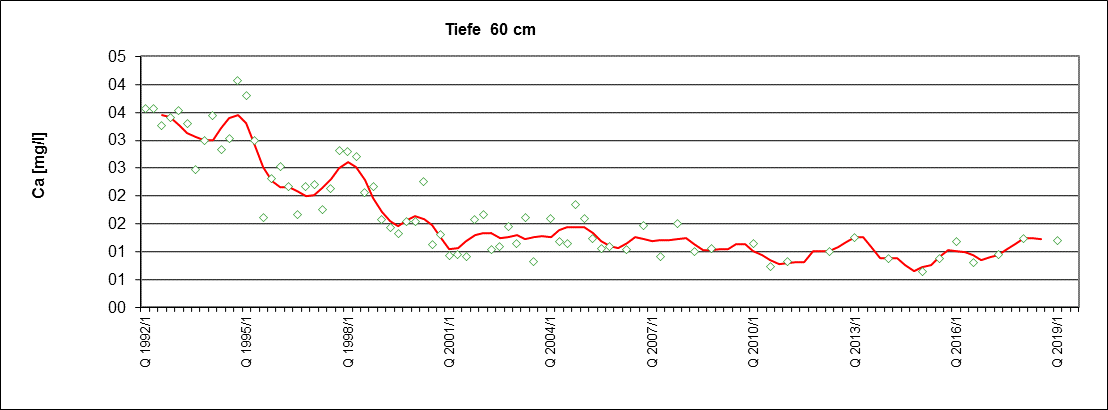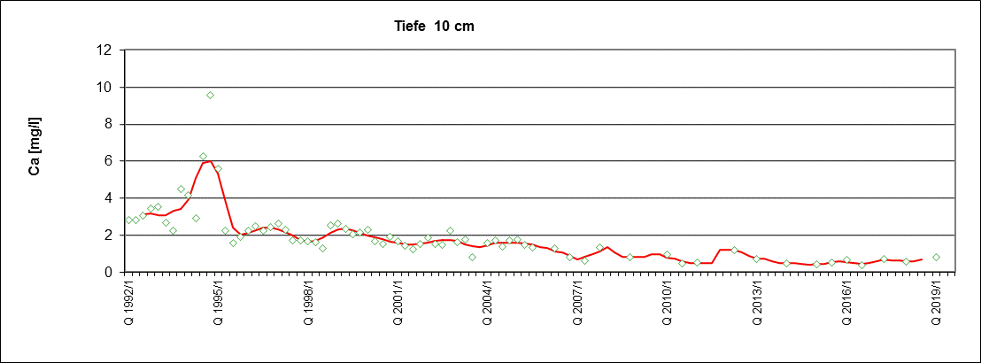 Mittelwert aus Quartalsmischproben von 3 bis 6 Saugkerzen (Rauten) sowie gleitendes Jahresmittel über 4 Quartale (durchgezogene Linie)